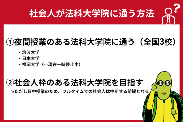 - 社会人が通える夜間法科大学院は全国で3校(うち1校は一時停止中)