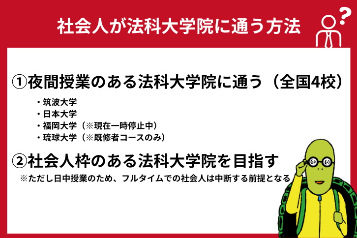 - 社会人が通える夜間法科大学院は全国で3校(うち1校は一時停止中)