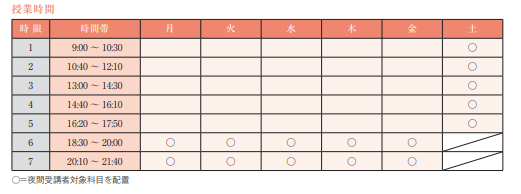 以下時間割の通り、平日は、夕方以降だと16:20~、18:30~、20:10~の授業があり、土曜日も開講しています。