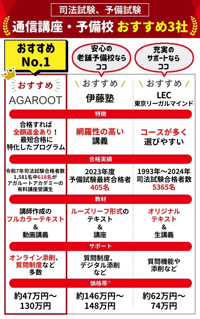このコラムでは、司法試験・予備試験の講座を扱っている通信講座・予備校7社を徹底比較してみました。