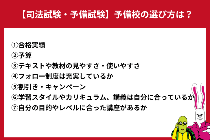 司法試験・予備試験の通信講座・予備校を失敗せず、選ぶためには、以下のような点をチェックし、比較検討する必要があります。