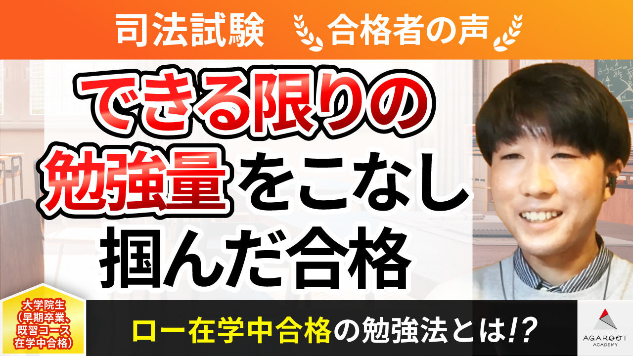 アガルートアカデミーは司法試験の過去問について、前年度揃えられており、しっかり過去問演習ができると考えました。実際、他の予備校と比較した際に講座で取り扱っている過去問がアガルートアカデミーの方が多いということがほとんどであったためその点が決定打になりました。