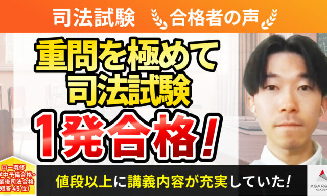 私は法学部に通っていましたが、本格的に法律の勉強を志したのは学部3年生の終わり頃であり、予備校に通って体系的な学習をしたいと考えていました。 そんな時に、アガルートのマネージメントオプションの存在を知り、右も左もわからない中で、すべての教科について講師によるしっかりとした指導を受けることができる点に魅力を感じて、アガルートアカデミーを選択しました。