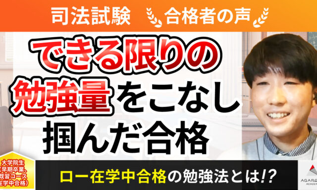 また、他の予備校に比べて教材がスマートにまとまっており、集中的で効率のいい勉強ができそうだったことも選んだ理由の一つです。当時、私はひとまずの目標として法科大学院合格を掲げており、試験まであまり時間がありませんでした。そのため、短期間で実力を伸ばすことができるアガルートの教材は私のニーズに合致するものでした。