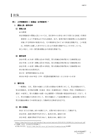 特に近年は、司法試験合格率の高い人気法科大学院を中心に、入試段階から高度な論文起案力と応用力が求められる傾向が強まっています。法曹コースの設置や早期卒業制度の導入により競争は一層激化し、入試時点で実力差が明確に出る状況です。