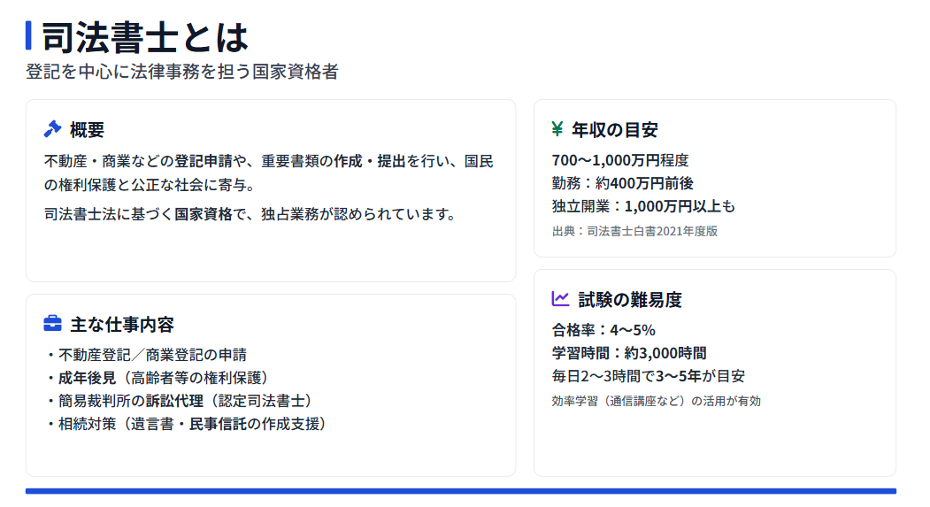 司法書士とは、簡単にいうと登記を中心とした法律事務の仕事をする専門家のこと。年収は700~1,000万円と高水準ですが、試験の合格率は4~5%、必要な勉強時間は3,000時間と屈指の難易度の高さです。