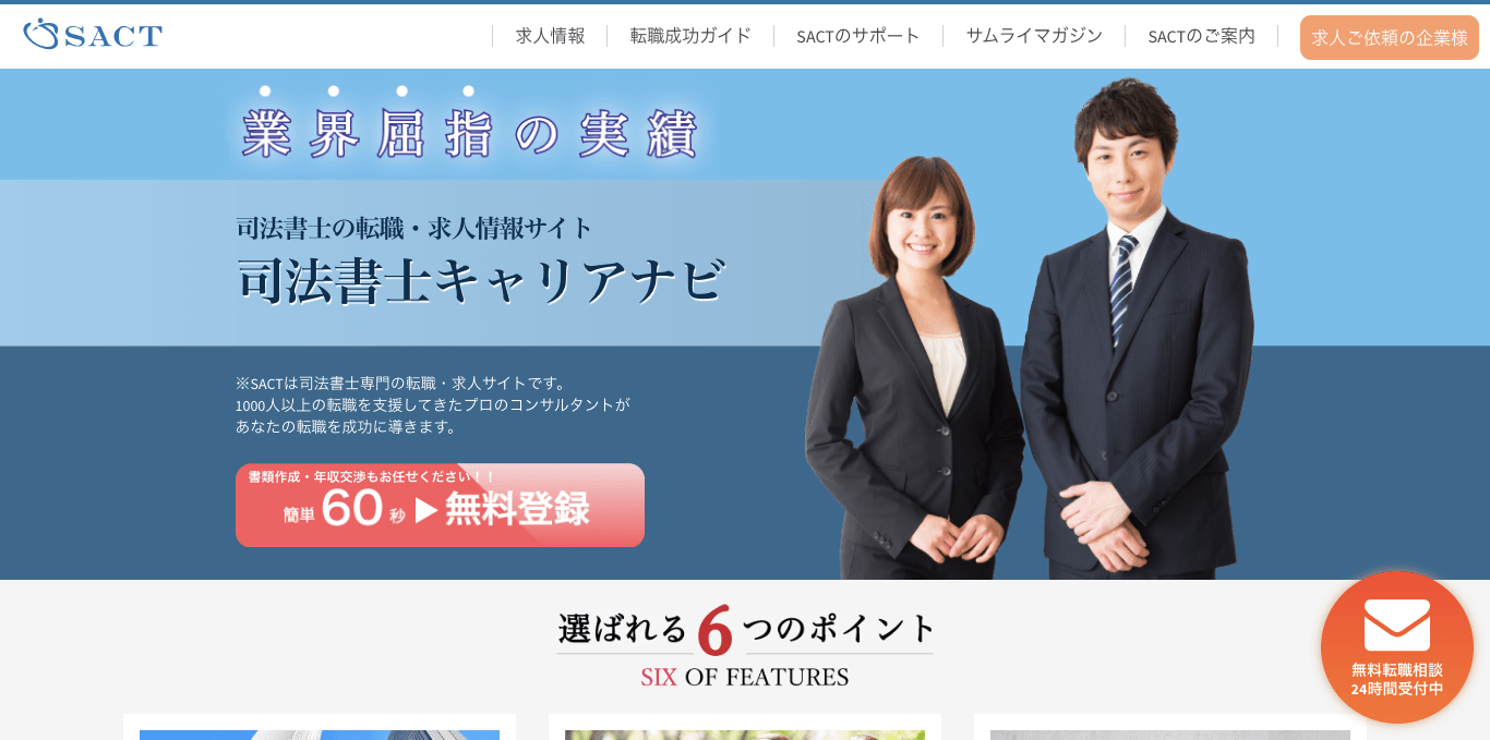 ![]() SACT | ・司法書士専門の就転職サイト ・1,000人以上の転職実績 |