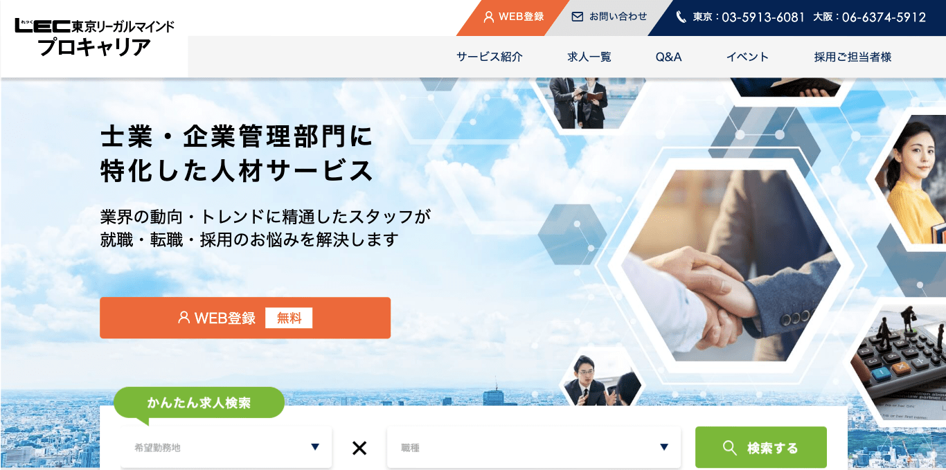 プロキャリアは資格取得予備校のLEC東京リーガルマインドと同じ運営元が提供する士業・企業管理部門向けの転職支援エージェントです。