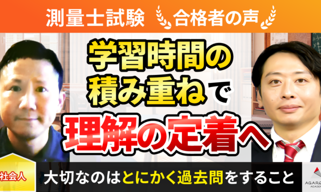 今回の合格要因は、択一、記述含め計算問題で点が取れたことだと思いました。アガルート講義では計算公式の「なぜ」をひも解いてくれ、暗記でなく理解に繋がる講義だったので計算問題のハードルを下げてもらえたと思います。計算問題にある程度自信が持てたことが、今回の測量士試験での大きな武器となり合格要因だと思いました。