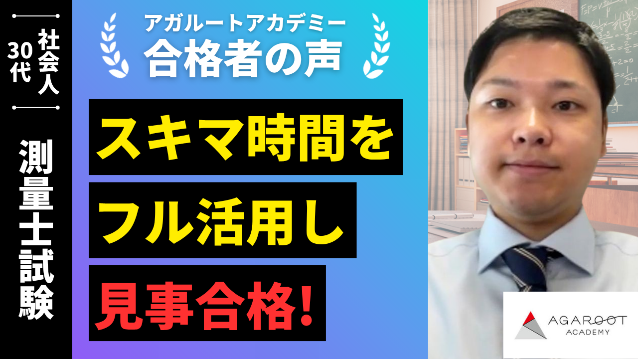 3年ほど前に他社の参考書を買い測量士の勉強を試みましたが、参考書が分厚くあまり進めないまま挫折しました。一方でアガルートの測量士講座の案内を拝見したころ、テキストも講義もコンパクトにまとまっていると知りこれであれば継続して勉強できるのではないかと思い受講を決意しました。