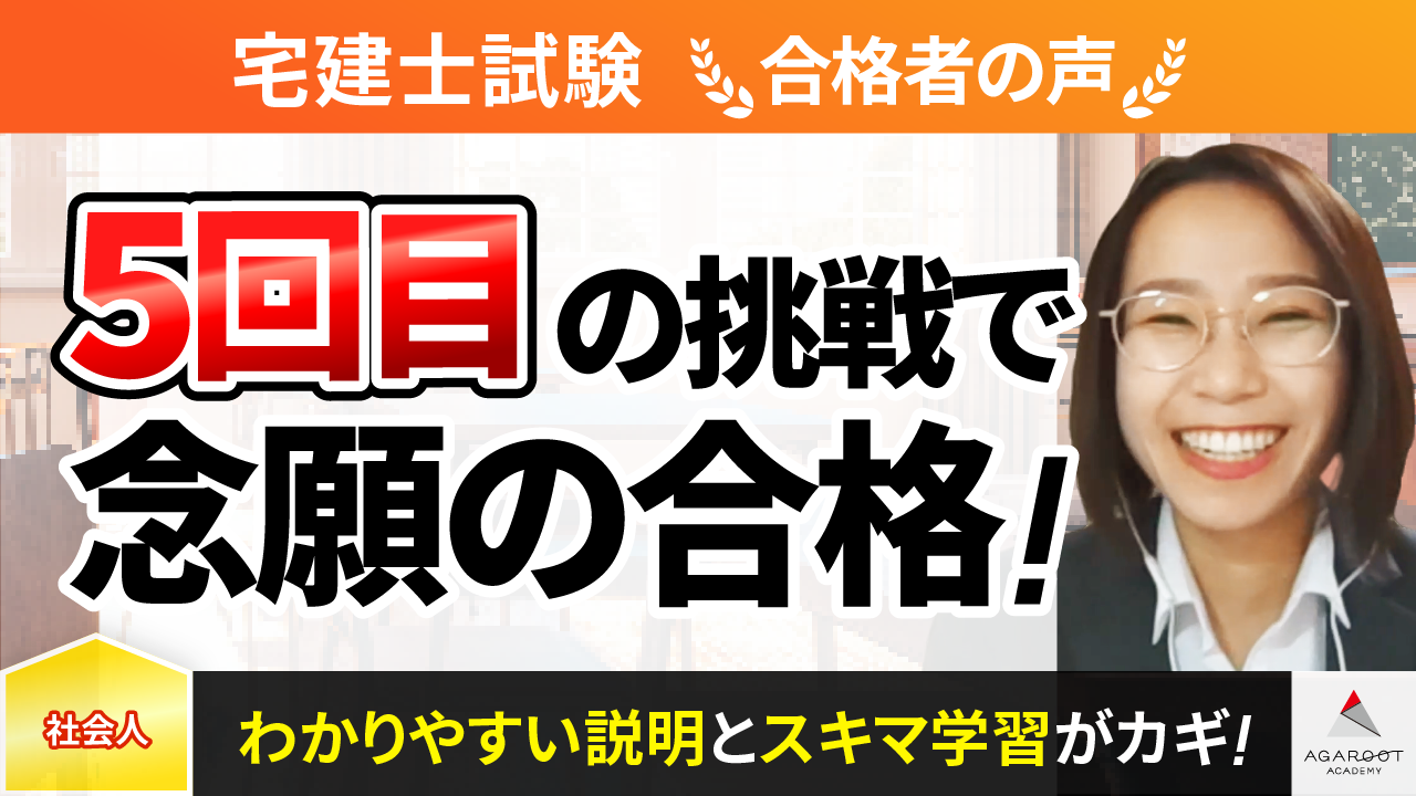 昨年合格された方が利用されていたので、SNSを通じて詳しくお話を聞いたところ、料金もお手ごろで、スキマ時間に利用しやすいと思いアガルートアカデミーの講座を受講しました。