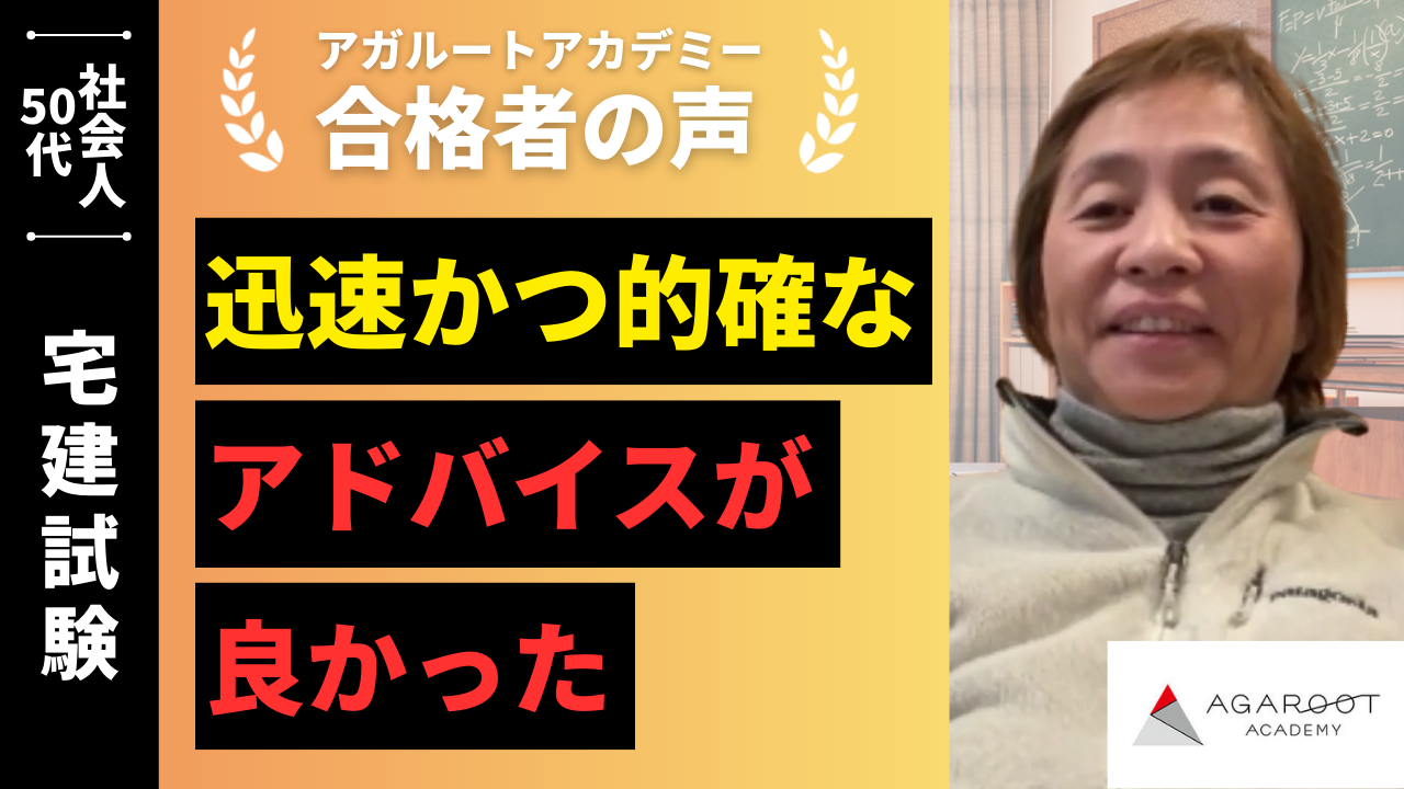 去年別の予備校にて、学習していましたが、3ヶ月という短期間であったこともあり、自己採点で惜しくも1点足りず不合格になってしまいました。そして、全体的な知識不足を感じ、別の予備校でリベンジしようと探していたところ、ネットでも評判が良く、サンプル講義も分かりやすかったアガルートアカデミーを選びました。