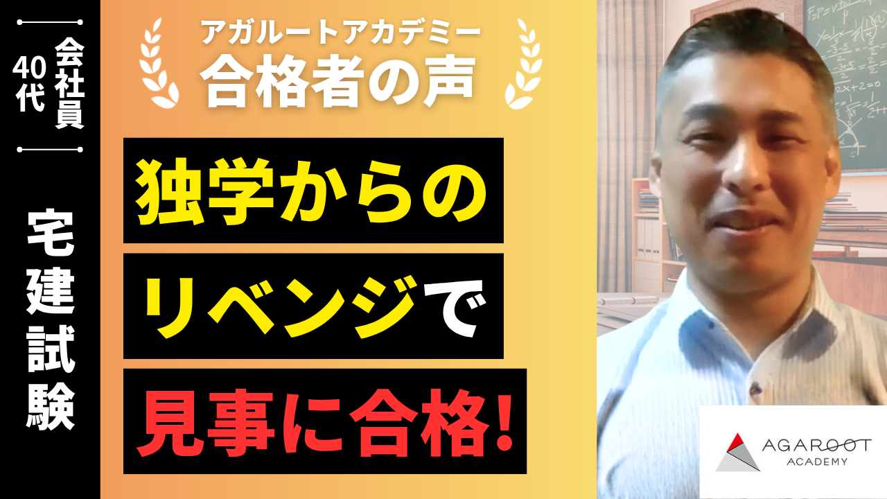 ネットで調べたところ複数の学校に絞ったが、アガルートにした決め手は合格特典と講座価格、無料講座での動画が良かったので決めた。