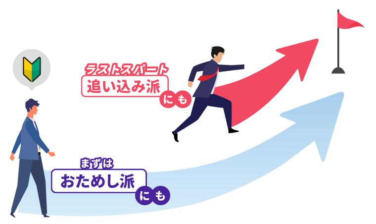 合格までの道のりは、一つではありません。時間をかけて緩やかなカーブを描きながら進むのか、それとも、最初に合格の要点だけを掴み、急角度で一気に合格レベルへ駆け上がるのか選ぶことができます。「キックオフ宅建士」は、初めて学習する方のロケットスタートにも、試験直前期の驚異の追い込みにも対応します。