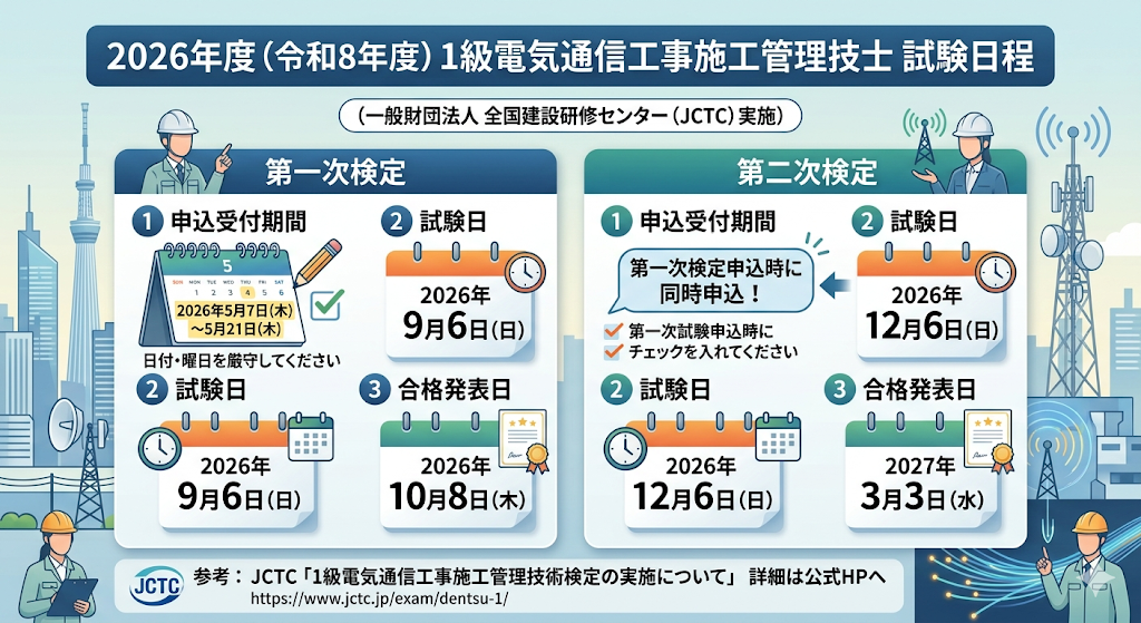 2026年度(令和8年度)の1級電気通信工事施工管理技術検定は、第一次検定が2026年9月6日(日)、第二次検定が2026年12月6日(日)に実施されます。