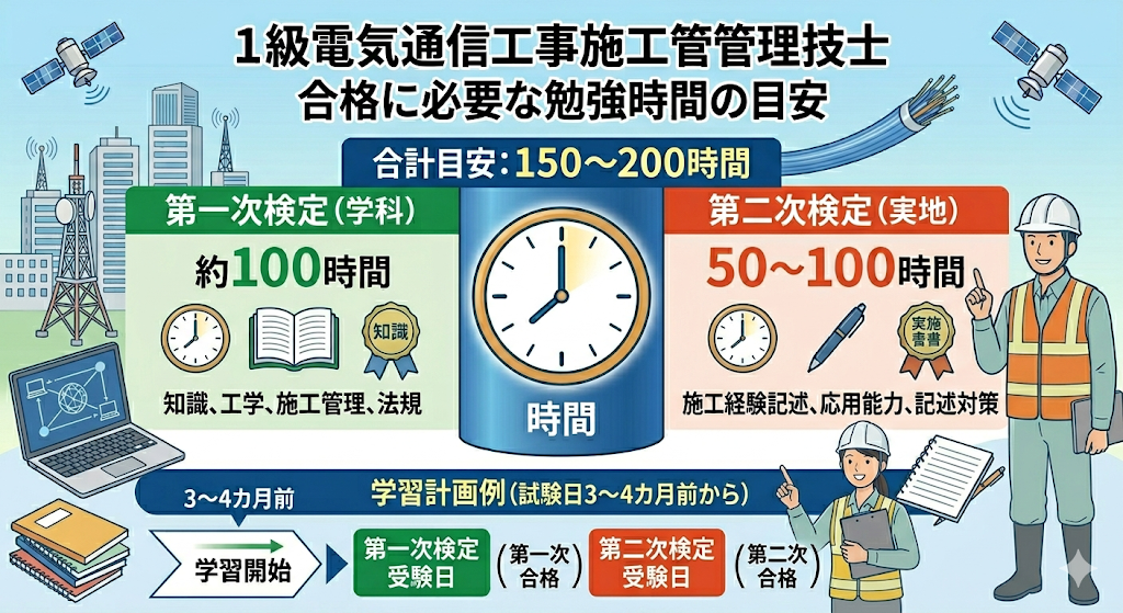 1級電気通信工事施工管理技士の合格には、150〜200時間程度の勉強時間が必要です。