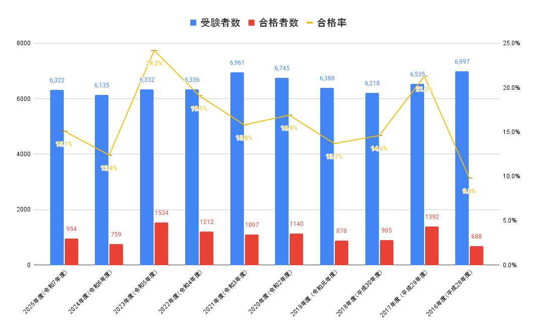 | 年度 | 受験者数 | 合格者数 | 合格率 |