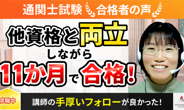 加藤先生とアガルートの皆さんに、たくさんのありがとうございます!をお伝えしたいです。アガルートを信用して通関士講座で勉強してとても良かったです。すぐには通関系や貿易系の仕事をする予定はございませんが、通関士を努力して勉強したおかげで、貿易系の知識が身につきました。仕事の幅が広がりました。これからのキャリアに活用する日が絶対に来ると信じます。