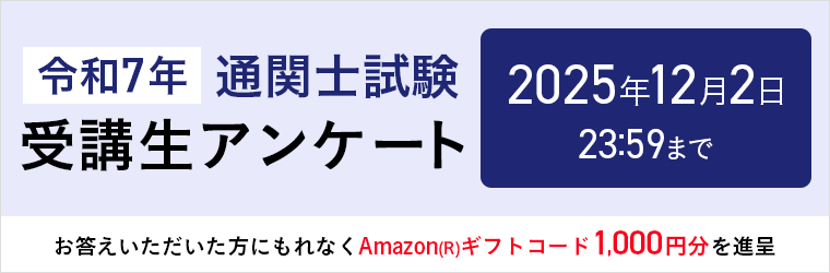 通関士試験の有料講座を受講され(※2025年合格目標以前で受講年問わず)、令和7年本試験に受験申込をされた方を対象として、合否確認を含む簡単なアンケートを実施しております。お答えいただいた方にはもれなくAmazon(R)ギフトコード1,000円分を進呈いたします。