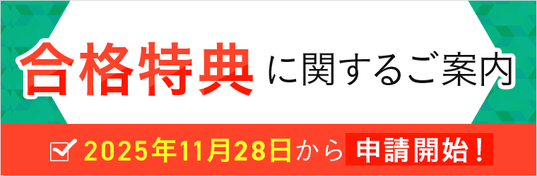 対象のカリキュラムを受講し、令和7年本試験に合格された方には合格特典をご用意しております。特典利用の条件等をご確認の上、是非、お申込みください。
