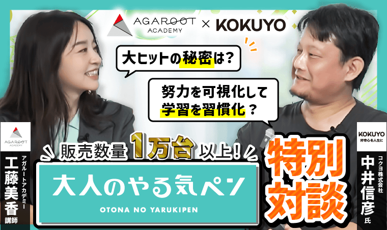 「毎日机に向かうのが辛い」「勉強仲間がいなくて孤独…」そんな大人の資格学習者のお悩みを解決する画期的なアイテムが、コクヨの『大人のやる気ペン』です。 今回は、アガルート講師の工藤美香が、コクヨ株式会社イノベーションセンター「やる気ペングループ」リーダーの中井様を訪問。商品の開発秘話や、学習モチベーションを維持する仕掛けについてお話を伺いました!