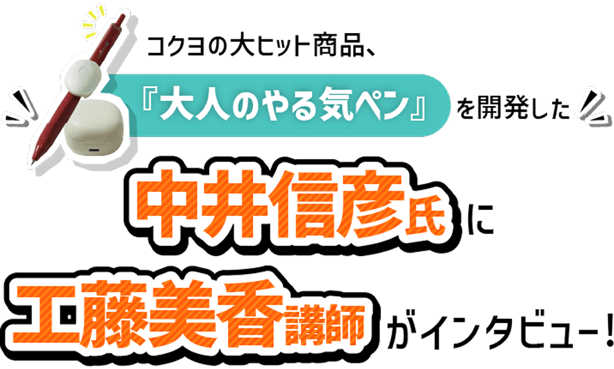 本日はコクヨさんにお邪魔しております。「大人のやる気ペン」について、開発担当の中井さんにお話を伺います。早速ですが、このアイテム、ペンの形をしていないんですね!