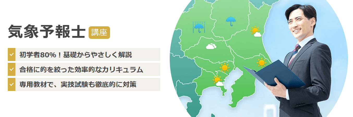 | アガルートアカデミー | ・現役気象キャスターによるわかりやすい講義 ・図やイラストを豊富に取り入れたフルカラーテキスト ・質問制度やホームルームなどのサービスを提供 |