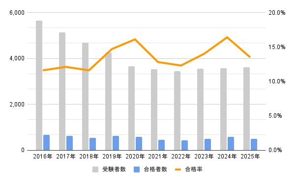 さらに、合格率自体も11~16%前後と低い値で推移しているため、その難易度は非常に高いといえます。