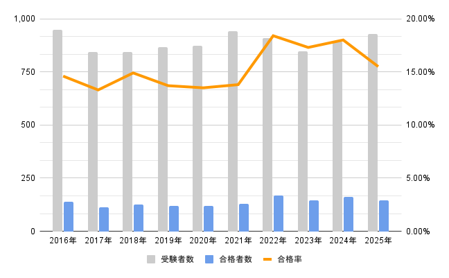 また、受験者数も900人前後で推移しており、そのうえで15%前後の合格率を推移していることからも、今後も高い合格率で推移することが想定されます。