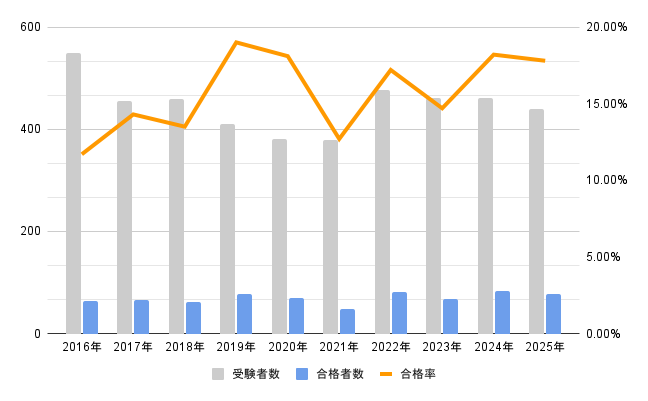 | 年度 | 受験者数 | 合格者数 | 合格率 |