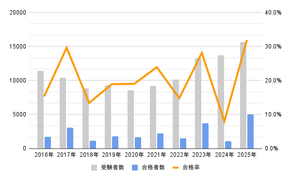 - 合格率は例年8~30%前後と、年度によって振れ幅が大きいこと